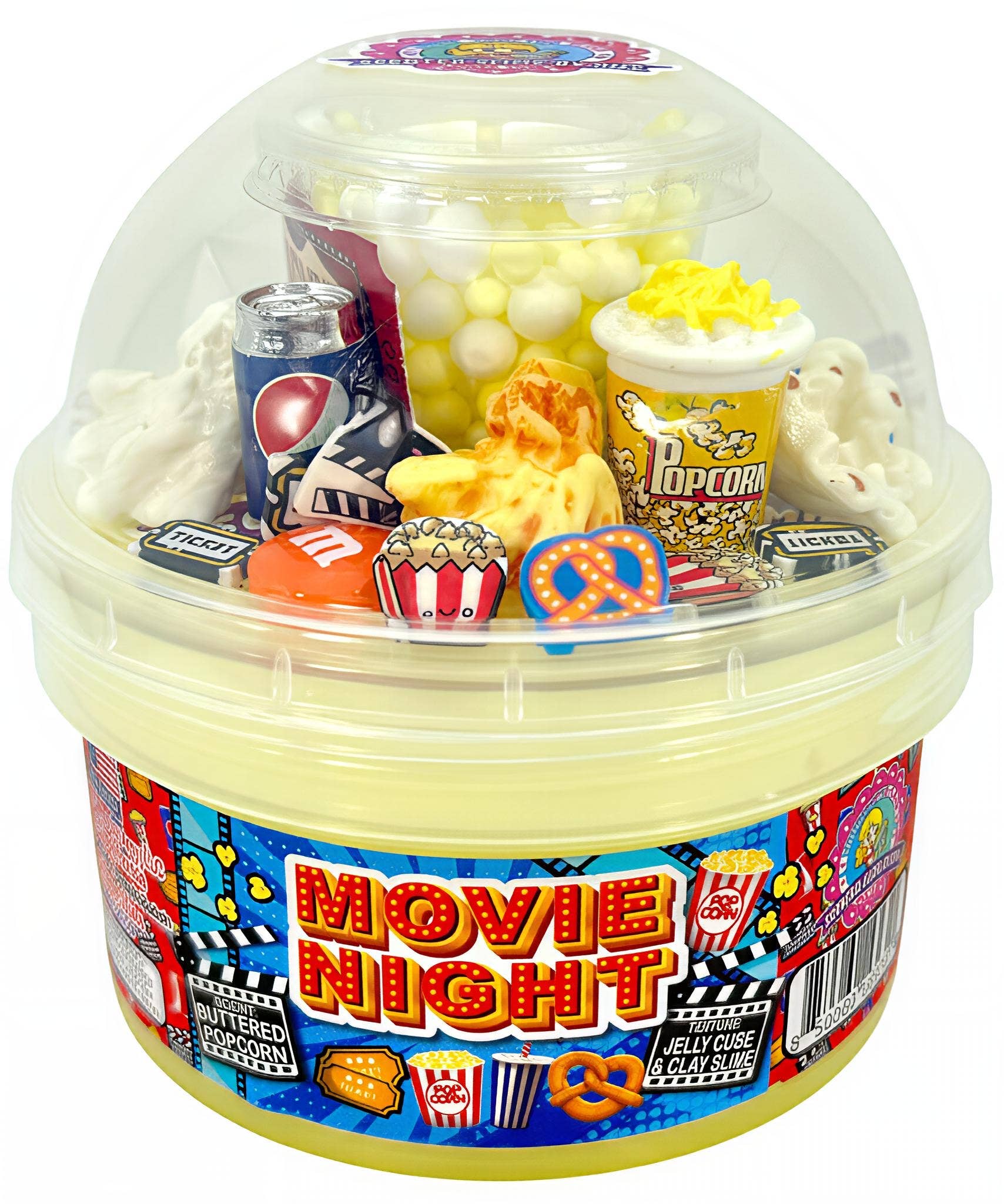Grab your snacks and get cozy with **Movie Night**! 🎬🍿 This fun jelly cube clay slime is scented just like hot, buttery popcorn fresh from the theater. Each dome is packed with adorable movie-themed charms like tiny popcorn pieces, a soda can, a popcorn bucket, mini candies, and even a cute little movie ticket, making it the perfect slime for any film lover’s collection! ✨